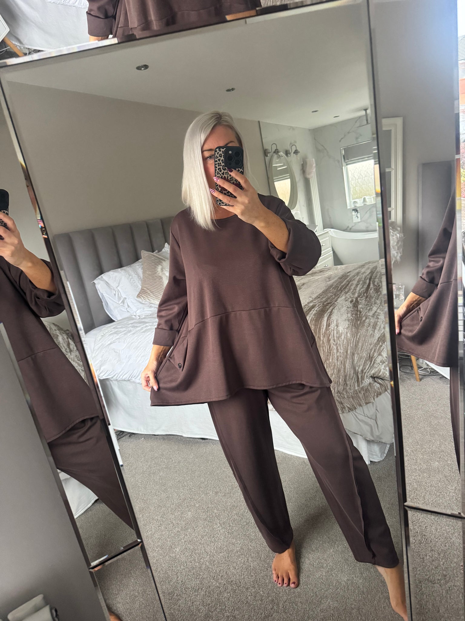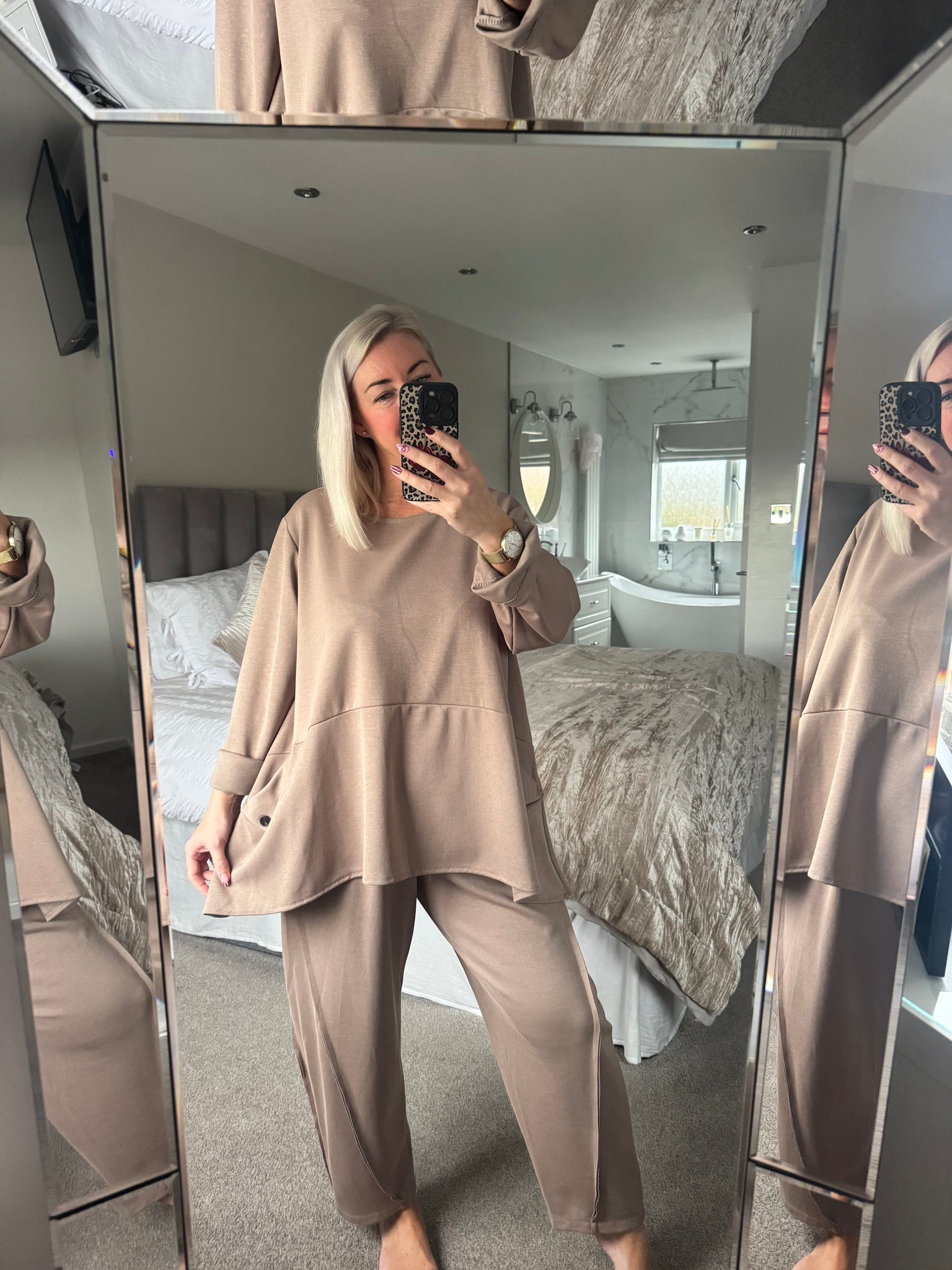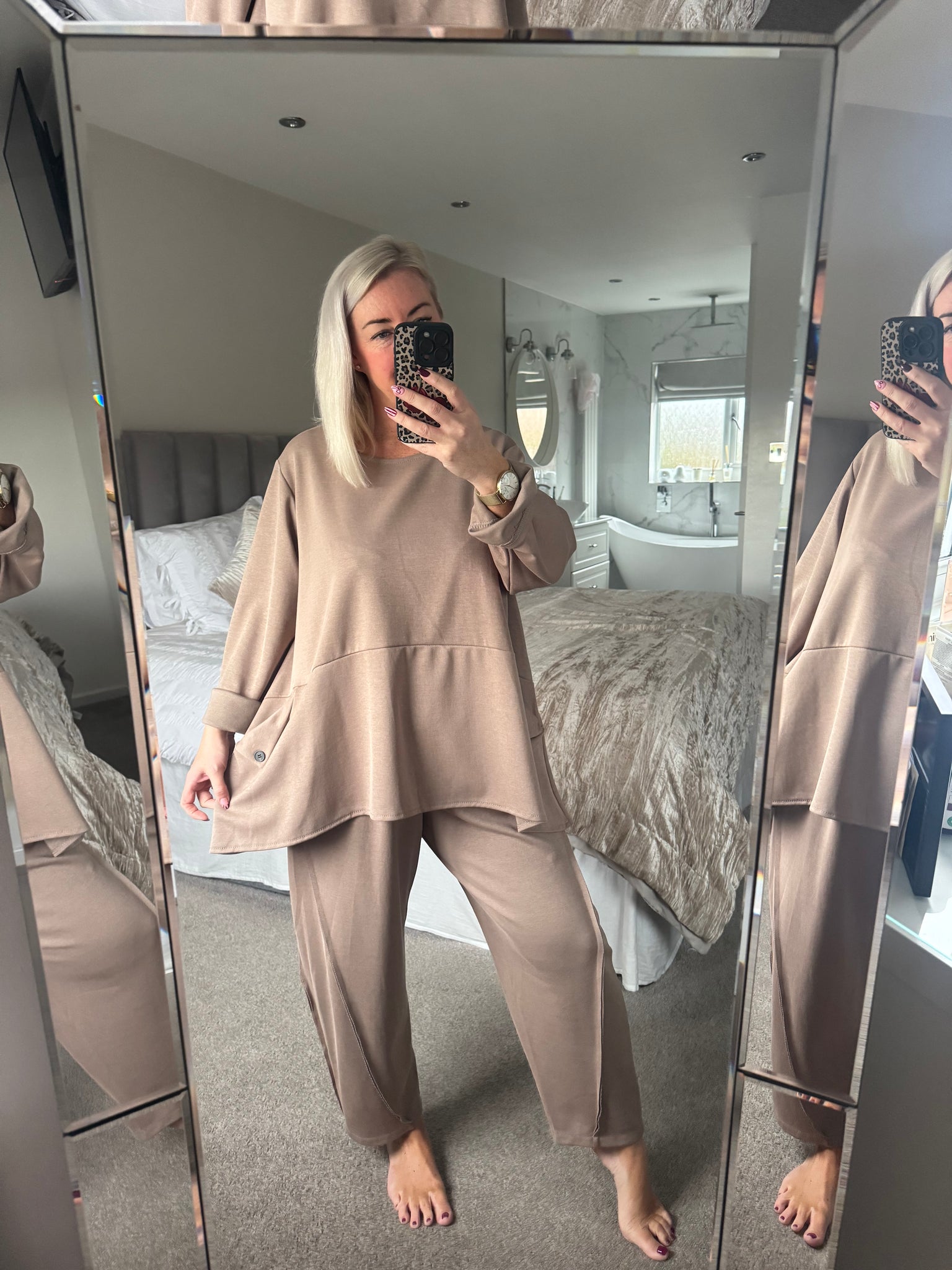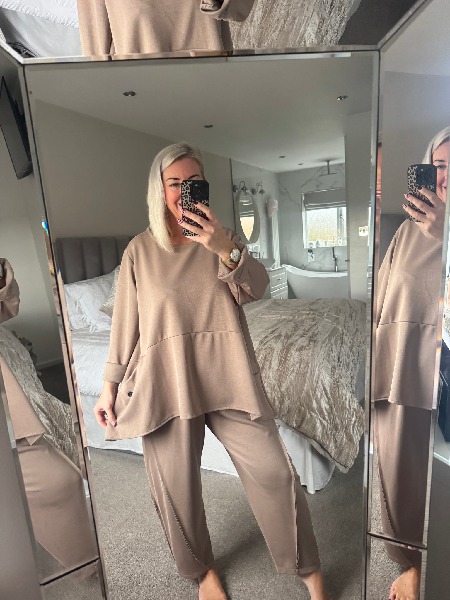 The Gabrielle luxe jersey dip hem exposed seam tracksuit